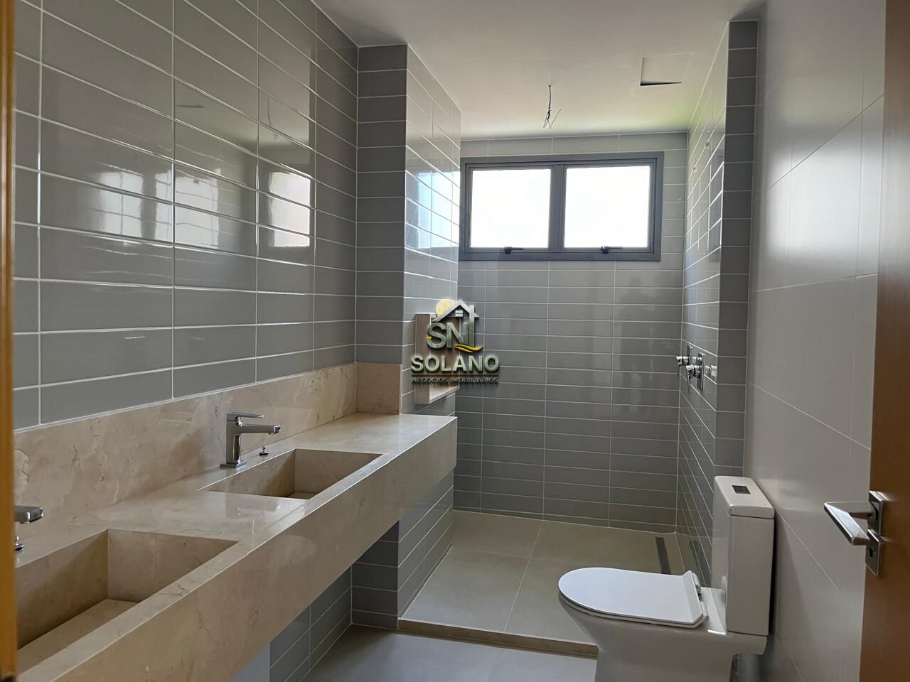 Todos os banheiros possuem nichos em mármore Crema Marfil, reforçando o acabamento de alto padrão presente em todos os ambientes.