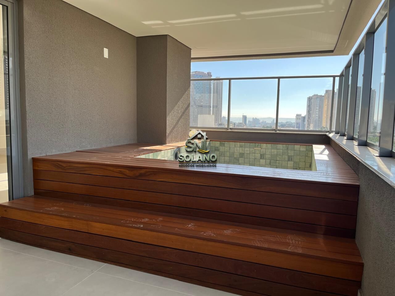 A varanda gourmet conta com piscina privativa com 84 cm de profundidade, borda em acrílico, aquecimento e tratamento por ozônio, oferecendo uma experiência única de lazer dentro do próprio apartamento.