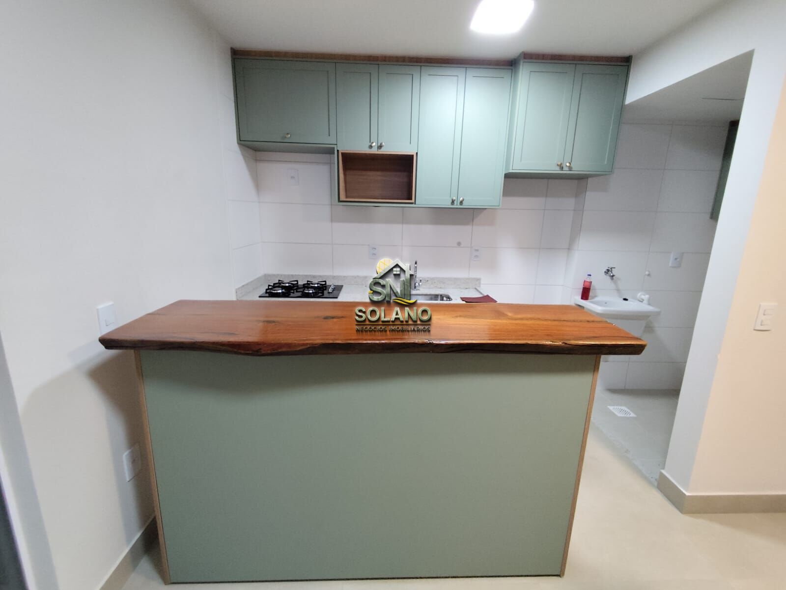A cozinha americana é integrada e equipada com cooktop e coifa, além de armários planejados em todos os ambientes.
