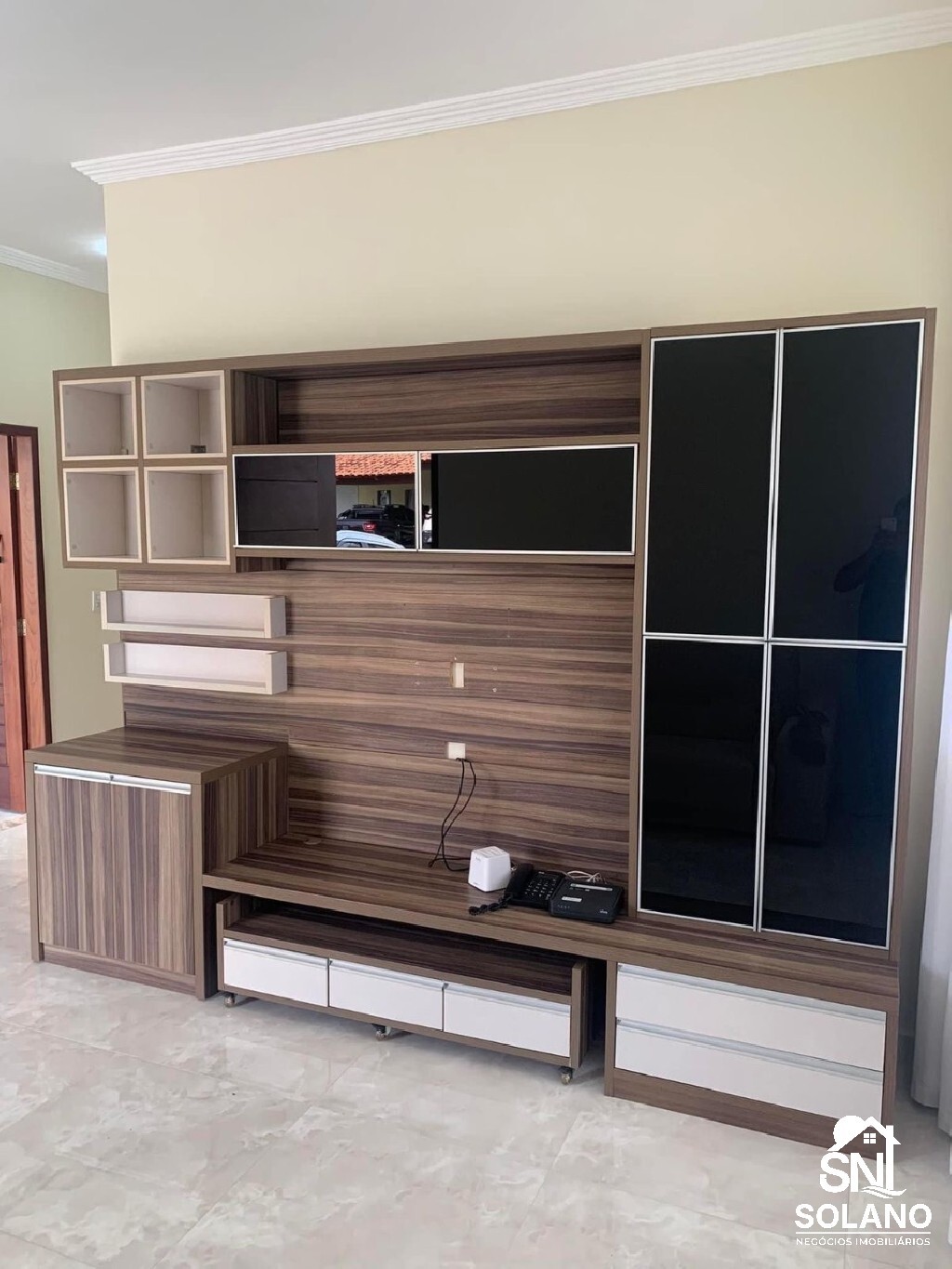 Suíte 2: Guarda-roupa de 3 portas com espelho, mesa de cabeceira, suporte de tv, cortina, ar condicionado, banheiro com armário e box;